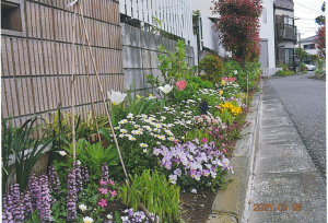 細田1丁目町会役員と有志で花壇管理をしており、四季を感じる色合いを重視した植付けで、保育園児やグループホームの方が見に来る花壇になっています。