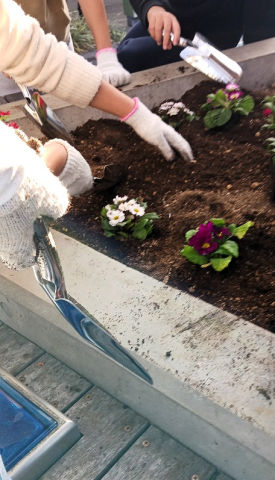 プリムラ、ナデシコ、ハボタン、キンセンカの4種類の花苗を植えました。