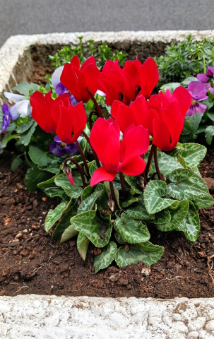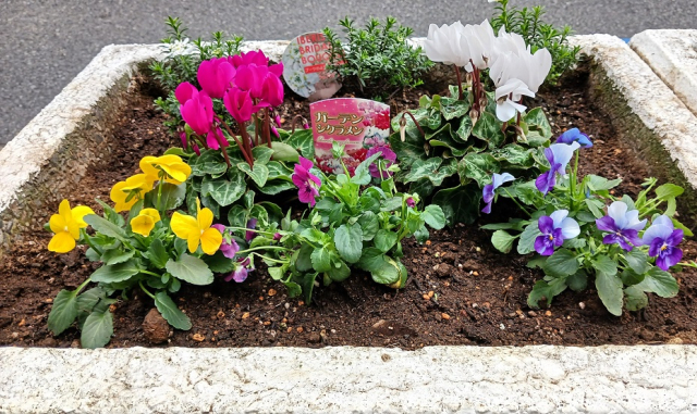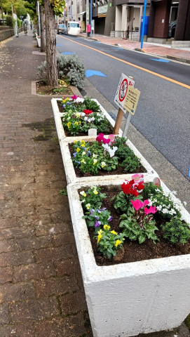 午前9時から、冬に向けての花植えを開始しました。 今回は、ガーデンシクラメン、ビオラ、イベリスを植えました。 コンテナ花壇のひとつひとつの寄せ植えが見どころになっています。 花苗の配置や配色がそれぞれ異なり、とても楽しめます。 街路樹のイチョウも色づき始めてきたので、花とともに季節を感じられます。 花植え後は会長宅のガーデンで、恒例のお茶会が開かれました。 話題が尽きることはなく、皆さん笑顔も満開でした。