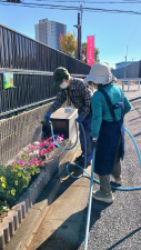11時頃から花壇周りの掃除や道具の片付け、花の水やりを順次はじめていきました。