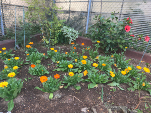 キンセンカの奥にはハイビスカスが!