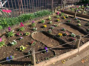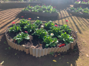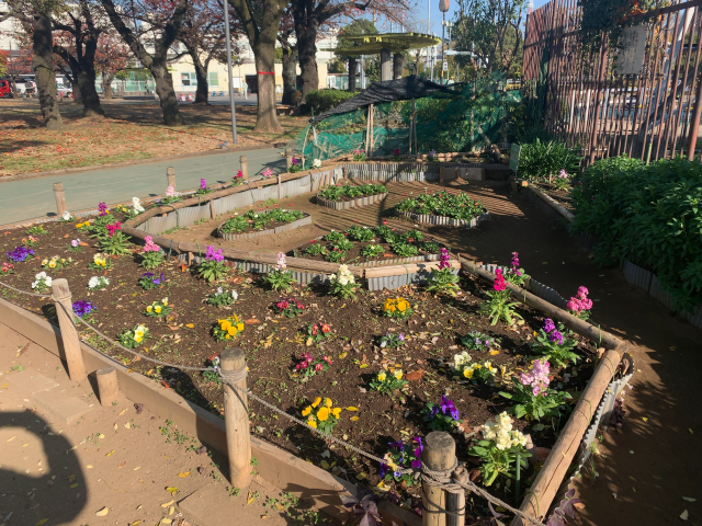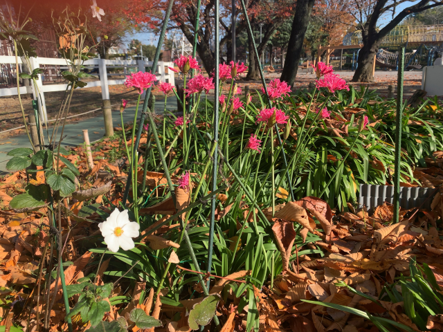 公園の健康遊具で体を動かしながら花を楽しめます。