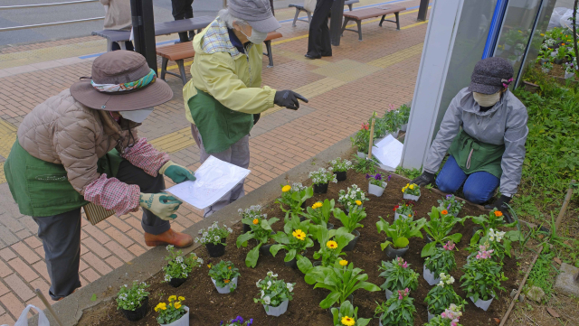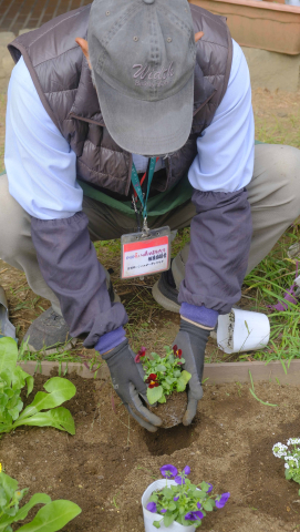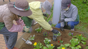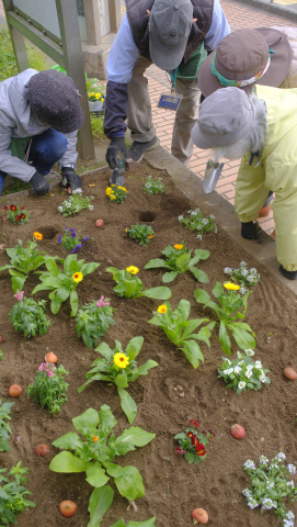 「パンジー&ビオラ・アリッサム・キンセンカ・キンギョソウ・ハボタン」と、球根「チューリップ・アネモネ」を植えました。 デザイン図を基に花鉢を置いて、バランスや配色などを確認してから、隙間全体に球根を置いていきました。 今回も「球根植え器」を使ういい体験ができました。便利な園芸器具です。 これから春に向かって次々に咲いてくるでしょう。楽しみです。