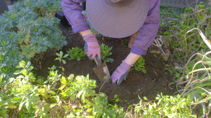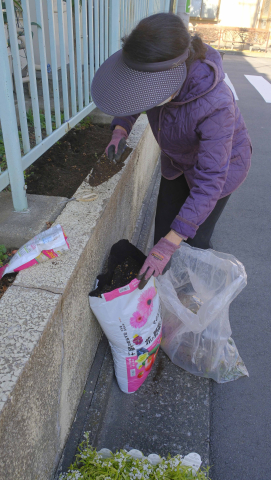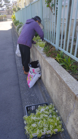 「パンジー・ビオラ」が元気です。これから一層咲いてくる勢いがあります。 花抜きはせず、空いているところを耕して培養土を撒きました。(後で肥料も足します) 園の外には「スーパーアリッサム」を、園内には「オステオスペルマム」も植えて終了。 宿根草が着実に根付き、そのエリアが増えてきました。楽しみですね。