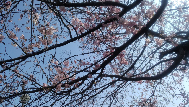 桜の花の隙間から空を見て