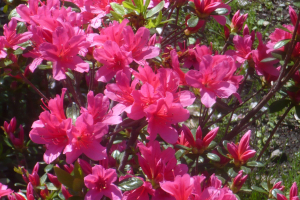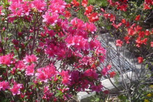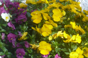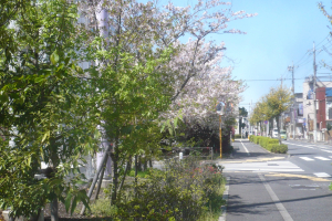 小合学園前の通りは、樹木につけた花が美しい季節になりました。また足元のパンジーも、見事に満開です。