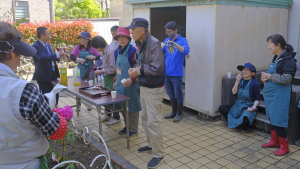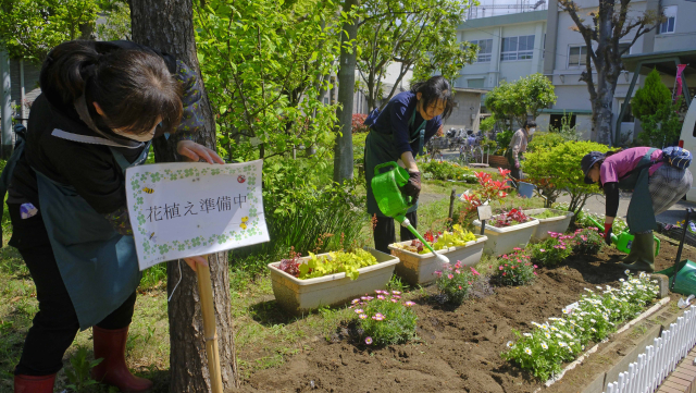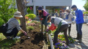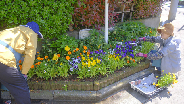 宿根草は残して、花抜きをしました。抜いた花は移植したり、花瓶に飾ったりしました。 花抜きをした後の土には有機石灰や堆肥、殺虫剤を撒き、1週間後にはいよいよ花植えとなります。 今年、花壇コンクールに2か所の花壇で応募しました。力がこもり、また、細部にも気配りした花抜きになりました。