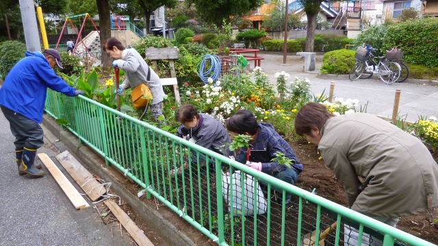 11月:第1回定例会。花の種2種を配布後、花壇見学の報告、植物がよく育つための堆肥や腐葉土などを使った「土」作りのノウハウ、安価な花の種で「鉢上げ」まで進んでいること、「パンジー」「スミレ」「ビオラ」の違いとは・・・?。最後に、H28年4月からの花壇構想をしておくことととして花壇作業へ。「コスモス」や「ホウキグサ」を抜き、花壇のへりに沿って土の流れを防ぐ板を取り付け、固くなった土を掘り返し、苦土石灰を散布。虫が食べた「ハボタン」、1本だけが蘇っていた。