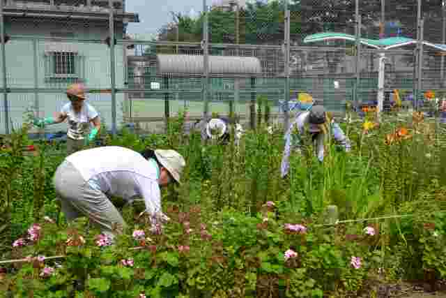 毎月第一土曜日の花壇管理です。事前に雑然とした右花壇に通路を造り、花苗7鉢、マツバボタンを植え付け、やや整然と出来上がりました。また、水やりホースを改良、水やりし易くしました。今日は周囲の草刈り、花壇の草取りを実施しました。残りの左花壇が手つかずの状態ですが、今、花盛りの状態で、9月に改良開始することにしました。作業終了後、連絡会を実施、11名の参加でした。