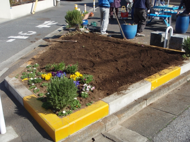 平成29年3月17日に花壇の植え替えを行いました。天気も良く6名のメンバーで、和気あいあい、仲良く植え替えました。植え替えの途中で通りかかった保育園児や、町の人たちも、みんな声をかけてくれました。町の中にある花壇として、地域のコミュニティに一役買っています。