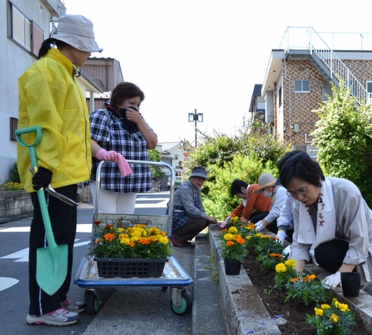 東京地方最高気温29℃の天気予報がでた良い天気のなか、松本センター長を含めて23名の参加による、マリーゴルドの植え付け作業が無事に午前10時ごろ終了した。5月末からの「葛飾菖蒲まつり」の堀切菖蒲園会場への通路として利用される。次回の植え付けは11月の予定と語る細野部会長。
