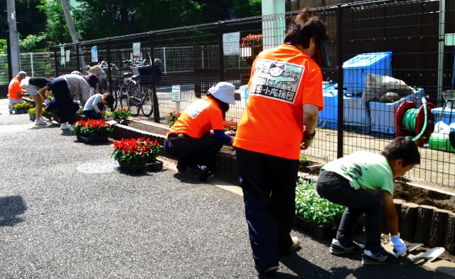 予報では今日の気温は39度。その通りに朝から真夏の暑さでした。にもかかわらず、小学生、卒業生も大勢参加し、総勢23人が集まりました。おかげで、30分ほどで植え終わることができました。小さい子には植え方、水やりなどを丁寧に教えています。