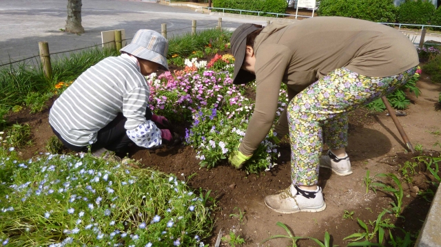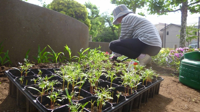 前日、密集していた「マリーゴールド」や「「ナデシコ」に、隙間を作るために移植した。「小さく、弱々しかった苗がこれほど大きくなるとは!」と、予想を超えた成長には驚きと喜びが。 本日は、咲き終えた「ネモフィラ」の後に、「パンジー・ビオラ」を移植した。 「ジュズダマ」の前には、ポットの中で大きくなった「コスモス」を植えた。秋の楽しみが増えた。