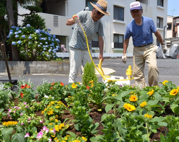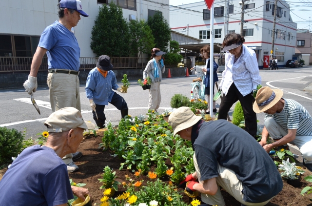 2017(平成29)年6月23日金曜日、晴天のもと今年度第1回目の花苗の植え付けを行いました。連日真夏日に近い気温でした。今日の予報でもまた最高温度が30℃となっていた。花の種類はヒマワリ、サルビア、メランポジューム、キンレンカ、アスター、トレニア、シロタエギクの7種類でした。配置計画は、中央にヒマワリを円形に配置し、その周囲にアスターを植えました。3角形の三角にサルビア、メランポジュウム、キンレンカをそれぞれ寄せ植えしました。「会員は、以前は町会組織で運営していましたが、現在はラジオ体操なかまで、和気あいあいと楽しくやっています。」と山根会長は語ってくれた。