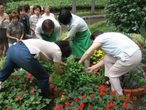 春、五輪カラーに合わせて青、黄、黒、緑、赤色の苗を選択。ただ、どうしても緑色だけは花がなくハーブに。一方で、今まで育てた花を眺めて楽しむだけでしたので、何か育てた苗を活用して楽しむ方法はないかと模索。ここに来て育てたスペアミントも大きく成長してきたので、みどりネットKotoに相談し、講師をお招きしてミントティ教室を開催。当初、野外を予定していましたが、天候が悪く、集会所に変更。熱心に講義に耳を傾けながら、いろんな質問も出たりしてあっという間の二時間が経過。摘んだミントだけでなく、その他のハーブティも味わうことが出来、楽しい勉強会になりました。ハーブの効能に認知症対策やボケ防止に有効との情報もゲット。ストレス解消に繋がり、リフレッシュできたアフターヌーンでした。