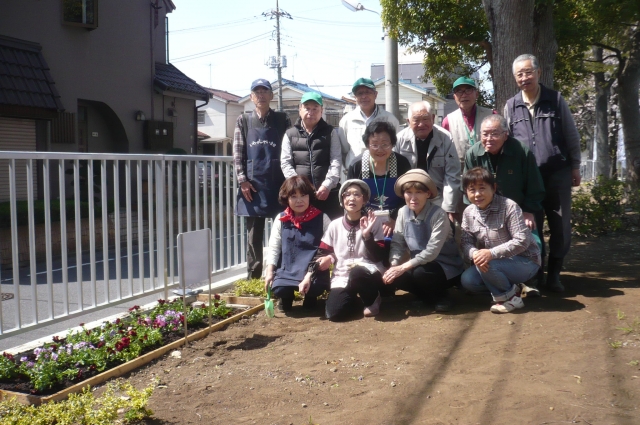 3月24日にオープンしたばかりの、水元スポーツ公園内に、緑化推進協力員会第1ブロックのお世話する花壇を新設しました。年度末の3月31日(土)、まさしく公園開設の1週間後に、メンバーが集合しパンジーの植え込みをしました。素晴らしい天気の春の日の、午前10時~11時までの短時間で見事な花壇できあがりました。