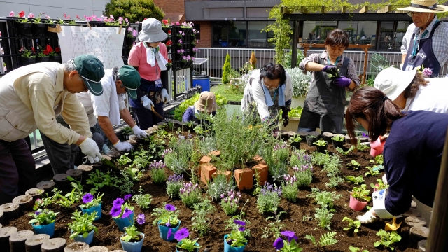 緑化推進協力委員の中のガーデンプロジェクト12人が、「へらぶねくん」「シャンシャンチーム」「ラブラブチーム」の3つの花壇に分かれて、共通のテーマ「仲間たちの輪」を掲げて花植えをしました。