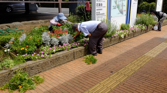 水を撒いてから、「ペチュニア」の花がら摘みをしました。どうも右側花壇の方が葉がよく伸びてきています。 赤い「サルビア」が次々に実によく咲き、葉の色がくすむほどになってきました。 伸びて曲がってきた「マリーゴールド」をさらに切り戻したら、当初の花壇デザインが浮き出てきました。 残暑厳しく、汗がたらたらとよく出る作業でしたが、来週の花壇が楽しみです。