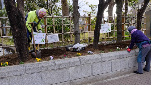 校門脇の「パンジー&ビオラ」はそのまま残し、「ハボタン」を校内花壇に移植しました。花色がまとまり、いい眺めになりました。 児童通用門脇の通称三角花壇の「キンセンカ・ノースポール」は、今を盛りと咲いているので、そのままにしておきました。 本日は花抜きをせず、花がら摘みや枯葉取りをし、最後に水をたっぷりあげて終了しました。 来週の花植えで、彩が増えます。