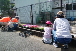 2019年5月19日㈰の午前9時から、花壇の植替えが開始されました。 陽光が暑いほどで、天気にも恵まれました。 15~16名の皆さんが集まり、原田小学校の校長先生、副校長先生も参加しています。 今日の花壇の植え替えに備えて、3日間かけて土を耕して、 そして前日の夕方には、水まきをしています。 ピンクと青のトレニア、アスター、ペンタス、ペチュニア、ランタナなどが、 花壇を彩っています♪