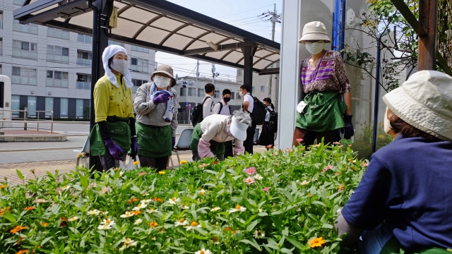 来る度に「ヒマワリ」が枝を伸ばし、花を増やしていて、まったく元気印の花です。 この花の剪定に際しては「長く伸びすぎた枝、下に垂れた枝を切るという他に、互いに交差している枝の場合はどちらを採るかを脇芽や全体のバランス」なども考慮して行います。 背丈の伸びた「ジニア」にも支え棒を使って花の向きを整えました。 最後に、肥料入りの水もたっぷり撒き、暑さも話の種にして、作業は終了しました。 来週も来ます。