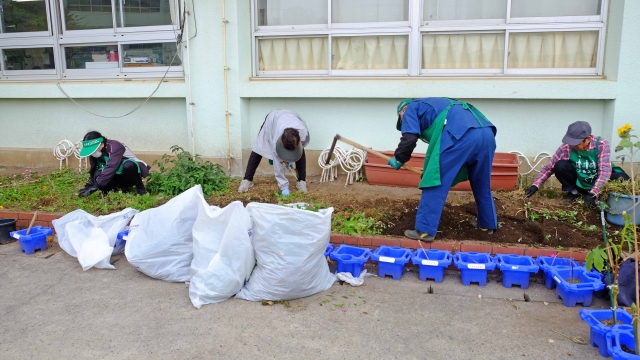 花抜き・草むしりをした後、土を耕しました。 「エンゼルストランペット」と「タイワンレンギョウ」の剪定もしました。 作業には経験を積んできたコツと勢いがあり、会話も弾みました。 休憩時間に食べた草餅で力がつき、後半の作業が終わりました。土が出て、花壇がすっきりとしました。 28日(土)の花植えまでには肥料を撒きます。