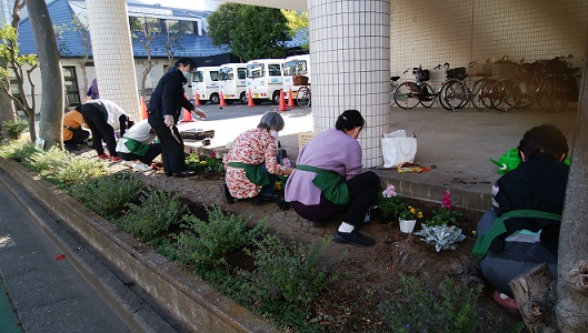 快晴の秋晴れの中、花植えを行いました。 お花屋さんから、花植えのレクチャー後、さっそく開始です!! まずはチューリップの球根を、前後、上下を見極めてから 花壇の奥に等間隔に並べていきます。 ストック、プリムラ、イベリス、ビオラ、シロタエギク の苗は色合いを考えながら配置を決めました。 配置が決まったら、分担して植えていきました。