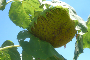 水元小学校の近くに区民農園があります。その農園の入り口脇の道路沿いに、大輪のヒマワリが紺碧の青い空との共演で、行き交う人々を楽しませてくれていました。