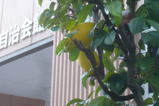 会館前のミニ花壇には、カリンが芳香を添えて、毎年実ります。