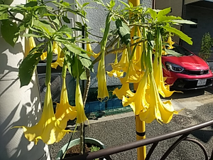 南水元を散策していたら,沿道電柱に寄り添いながら美しく咲いている、エンジェルトランペットを見つけました。
