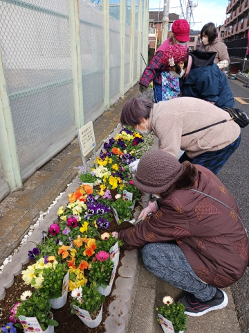 強い風が吹いて寒い中、9時30分前から集合し、花壇の植え替えが始まりました。