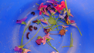 「ツマグロヒョウモン」の幼虫が「パンジー&ビオラ」の陰にいました。 それを機に探してみたら、いるわいるわ、今までにないほど次々に見つけました。 花弁などをまだ食べてはいませんでしたが、この先が心配です。今年はいつになく多く見つかっているという情報もありましたから・・・。 花がら摘みをしながら土に指を差し込んでみると、土の表面は乾いているものの下側は湿っていたので、この時期には「根を伸ばそう!」と、水撒きをせず、花がら摘みだけで終了しました。