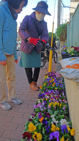 園児や保護者、地域の方たちも通る道。ちょっと緊張しながら花植え。