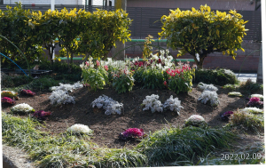 園芸デザイン科の生徒さんが授業の中で植栽し管理されている花壇です。季節ごとに年4回(春・夏・秋・冬)デザインを一新しています。学校の顔として、登校する生徒、来校者、地域の方から愛される花壇を目指しています。