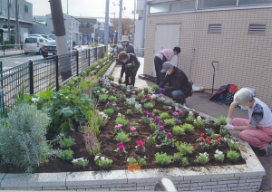 平成28年度に開催された「花壇づくりボランティア養成講座」を受講したメンバーで、週1回の活動をされています。年2~3回植替えをして、区役所を訪れる方やバスの利用者に憩いと潤いの場となっています。