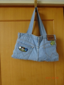 サイズが合わなくなっった夫のジーパンで、ショルダーバッグを作りました。足の部分を縫い合わせて、前掛けもできちゃいました。