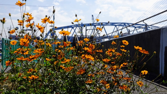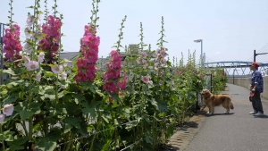 700mにわたる中川左岸緑地帯には、4月「ジャーマンアイリス」、6月「タチアオイ」、夏には「ひまわり(背丈120cmほど)」、秋には「コスモス」、そして冬には「皇帝ダリヤ(八重)」が咲く。